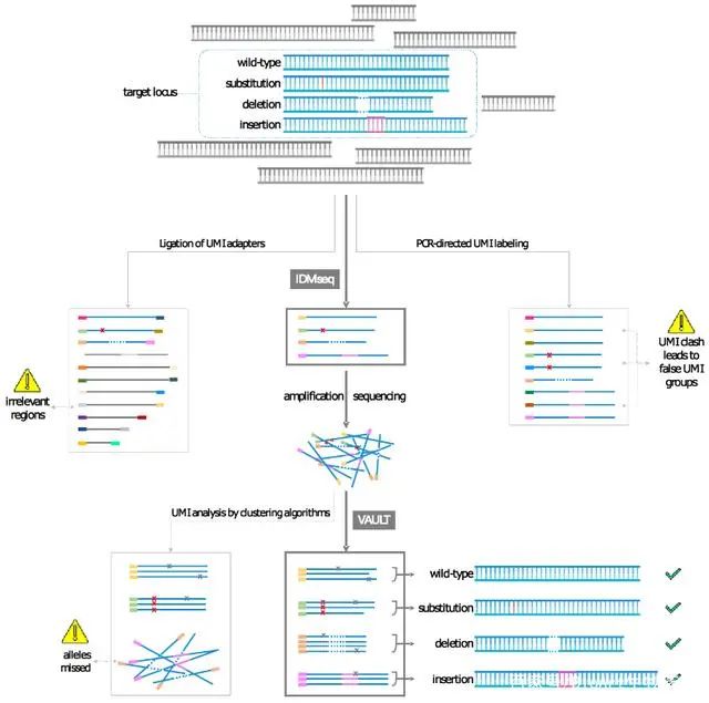 研究團(tuán)隊(duì)利用分子標(biāo)簽定向的標(biāo)記樣品中目標(biāo)基因的原始DNA分子,之后利用PCR的方式擴(kuò)增標(biāo)記到的分子用以測(cè)序。該技術(shù)配套的數(shù)據(jù)分析算法VAULT(variant analysis with unique molecular identifier for long-read technology)可以從測(cè)序結(jié)果中發(fā)現(xiàn)并提取分子標(biāo)簽,然后利用分子標(biāo)簽將測(cè)序的數(shù)據(jù)(read)分組。每個(gè)組都代表初始體系中的一個(gè)DNA分子,于是可以利用同一個(gè)組內(nèi)的所有數(shù)據(jù)進(jìn)行測(cè)序糾錯(cuò),從而得到高精度的突變結(jié)果。該技術(shù)廣泛適用于當(dāng)前的主流高通量測(cè)序平臺(tái),包括Illumina, PacBio 和Nanopore。研究表明運(yùn)用該技術(shù)后,高錯(cuò)誤率的Nanopore測(cè)序可以提供媲美Illumina的罕見(jiàn)突變檢測(cè)效果,準(zhǔn)確的檢測(cè)到了預(yù)設(shè)的1:100、1:1000、1:10000的罕見(jiàn)點(diǎn)突變并正確的報(bào)告出該突變的頻率。