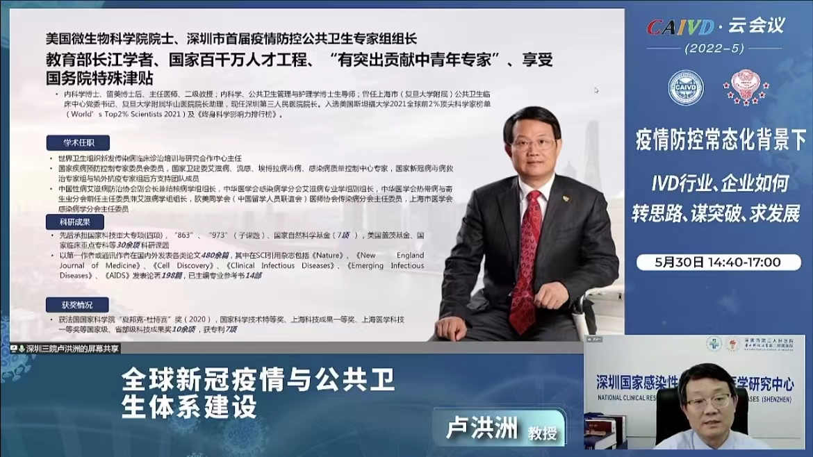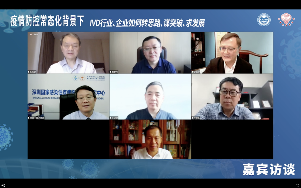 本次線上會議邀請到了上海市實(shí)驗(yàn)醫(yī)學(xué)研究院副院長、全國衛(wèi)生產(chǎn)業(yè)管理協(xié)會醫(yī)學(xué)檢驗(yàn)產(chǎn)業(yè)分會會長、VIEW 期刊榮譽(yù)主編、CACLP創(chuàng)始人宋海波教授,上海市實(shí)驗(yàn)醫(yī)學(xué)研究院院長、全國衛(wèi)生產(chǎn)業(yè)管理協(xié)會實(shí)驗(yàn)醫(yī)學(xué)分會主任委員、VIEW 期刊主編王華梁教授,美國微生物科學(xué)院院士、深圳市首屆疫情防控公共衛(wèi)生專家組組長、深圳市第三人民醫(yī)院黨委副書記、院長盧洪洲教授,國家衛(wèi)生健康委臨床檢驗(yàn)中心副主任兼臨床分子與免疫室主任,北京協(xié)和醫(yī)學(xué)院和北京大學(xué)醫(yī)學(xué)部博士生導(dǎo)師,衛(wèi)生部有突出貢獻(xiàn)中青年專家李金明教授,浙江東方基因生物制品股份有限公司總經(jīng)理方效良,深圳市亞輝龍生物科技股份有限公司首席科學(xué)家夏福臻博士,中元匯吉黨委書記、副總經(jīng)理兼首席科學(xué)家易維京博士和大家一起就疫情防控常態(tài)化背景下IVD行業(yè)的發(fā)展展開了交流和探討。