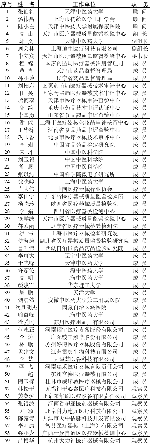 第一屆中醫(yī)器械標(biāo)準(zhǔn)化技術(shù)歸口單位人員名單見下表,秘書處由天津市醫(yī)療器械質(zhì)量監(jiān)督檢驗(yàn)中心承擔(dān)。國(guó)家藥監(jiān)局醫(yī)療器械標(biāo)準(zhǔn)管理中心負(fù)責(zé)業(yè)務(wù)指導(dǎo)。