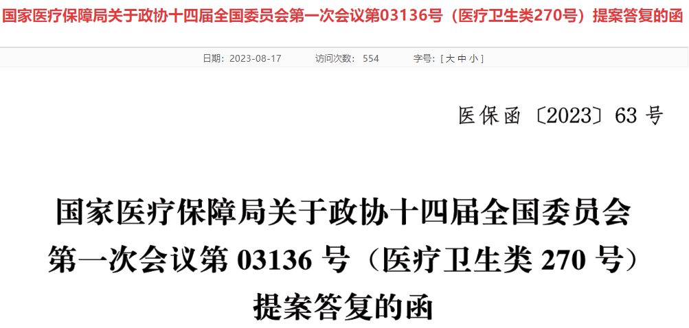 2023年8月17日,國家醫(yī)保局發(fā)布了提案建議回復(fù),國家醫(yī)療保障局關(guān)于政協(xié)十四屆全國委員會第一次會議第03136號(醫(yī)療衛(wèi)生類270號)提案答復(fù)的函,將霍勇等 4位委員提出的《關(guān)于將罕見病用藥保障機(jī)制納入國家(醫(yī)療保障法)的提案》收悉,正式答復(fù)。