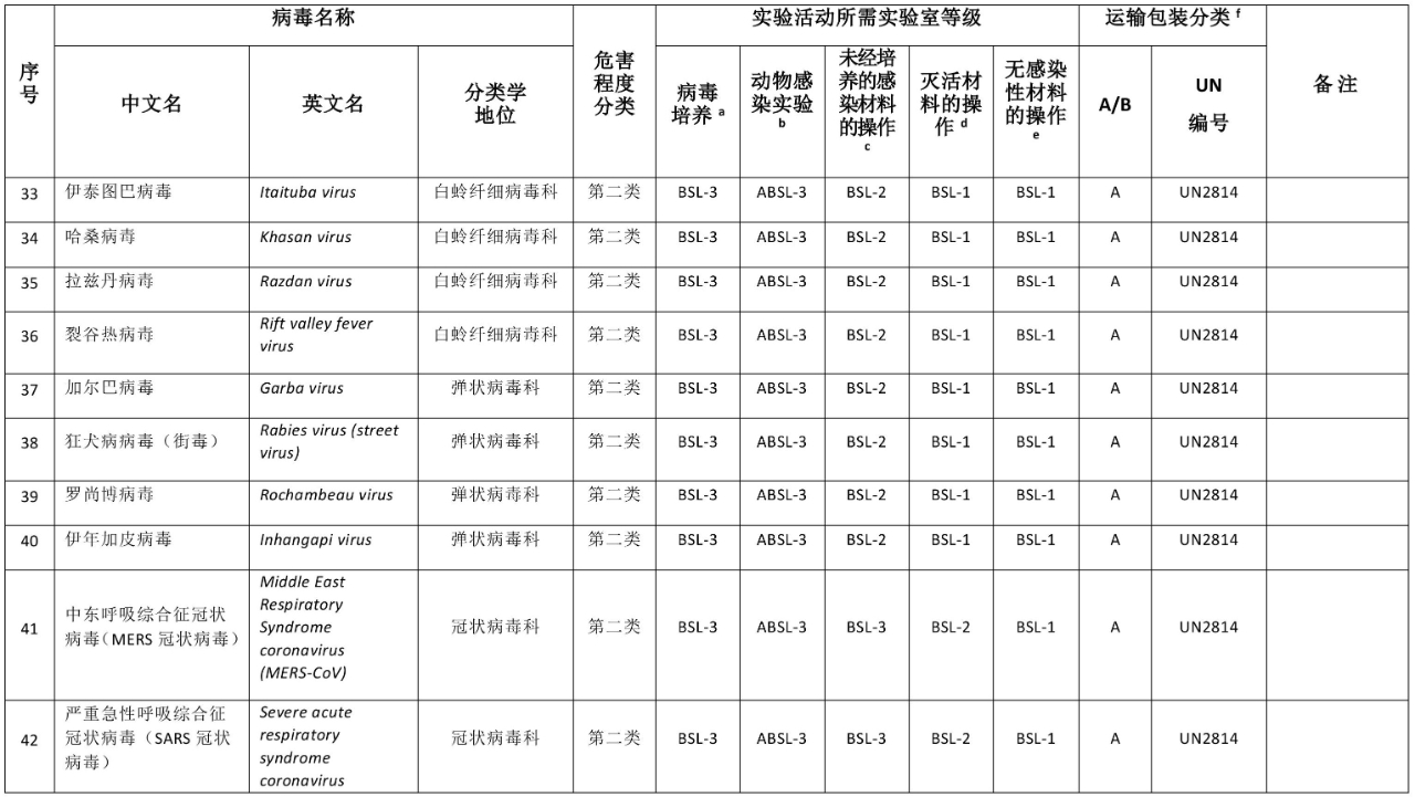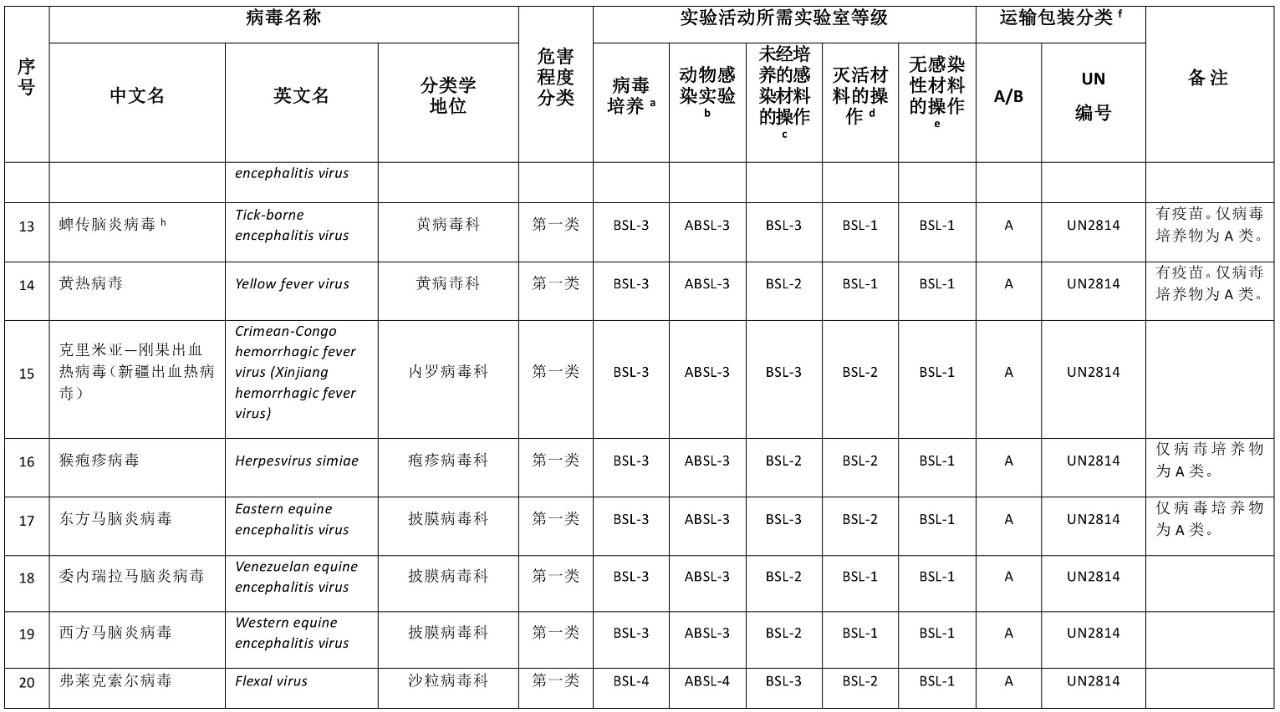 四是猴痘病毒“未經(jīng)培養(yǎng)的感染材料的操作”實驗活動所需實驗室等級由三級降為二級。駱駝痘病毒和登革病毒的聯(lián)合國危險貨物編號(UN編號)由“UN2814”修訂為“UN3373”,并且登革病毒的運輸包裝等級降為B類。H2N2流感病毒運輸包裝等級由B類升為A類。