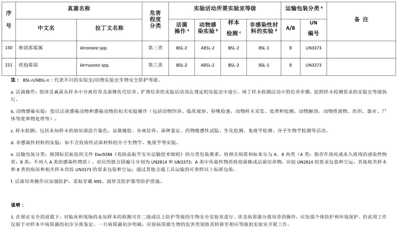 一是新增危害程度分類為第二類的真菌2種,新增危害程度分類為第三類的真菌118種。刪除22種真菌,合并部分真菌條目。原皮炎芽生菌的危害程度分類由第三類升為第二類,相應(yīng)調(diào)整實驗活動和運輸管理要求。