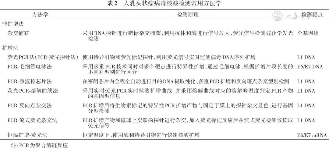 目前,我國HPV核酸檢測(cè)常用技術(shù)多以核酸擴(kuò)增法及其衍生技術(shù)為主,包括:恒溫?cái)U(kuò)增法、熒光PCR(PCR-熒光探針法)、PCR-毛細(xì)管電泳法、PCR-微流控芯片法、PCR-熔解曲線法、PCR-反向點(diǎn)雜交/流式熒光雜交法等[55,57-58]?傮w而言,HPV核酸檢測(cè)向著更多分型、更高靈敏度、更高特異度、更加自動(dòng)化方向發(fā)展(常用方法學(xué)見表2)。
