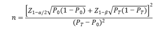 公式中,n為樣本量;Z1-α/2、Z1-β為顯著性水平和把握度的標(biāo)準(zhǔn)正態(tài)分布的分?jǐn)?shù)位,P0為評(píng)價(jià)指標(biāo)的臨床可接受標(biāo)準(zhǔn),PT為申報(bào)產(chǎn)品評(píng)價(jià)指標(biāo)預(yù)期值。