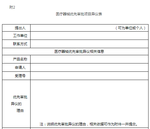 2.醫(yī)療器械優(yōu)先審批項(xiàng)目異議表