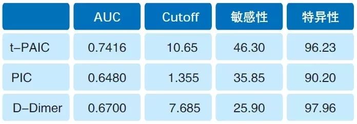 表2:PIC、t-PAI-C與DD診斷骨科術(shù)后血栓形成的受試者工作曲線