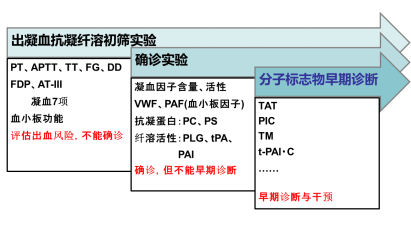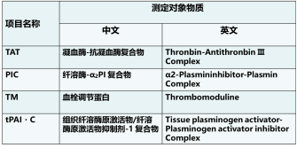 現(xiàn)有的方法學(xué)涵蓋了凝固法、發(fā)色底物法、免疫比濁法,除了常規(guī)的血栓與止血檢測項目外,臨床希望能夠在血栓的早期檢測中提供有效的診斷標志物,例如TAT、PIC、TM、tPAI-C等分子標志物(相應(yīng)的中英文全稱及縮寫詳見下圖),從而幫助臨床進行診斷與干預(yù)治療。