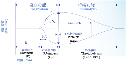 血栓彈力圖系采用物理和化學(xué)的方法檢測血液凝固狀態(tài)。37℃條件下,抗凝全血在圓柱形的檢測杯中,以4°45′來回擺動,接觸血液的懸垂絲穿過杯蓋連接扭力傳感器。血樣呈液體狀態(tài)時,杯子的擺動不影響杯蓋;當血凝塊一旦形成,使信號的振幅增加直到最大;當血凝塊回縮或溶解時,杯蓋與血凝塊的聯(lián)結(jié)解除,杯的運動不再傳遞給懸垂絲。扭力轉(zhuǎn)換成電子信號,通過A/D轉(zhuǎn)換盒從而在電腦上形成血栓彈力圖圖形(見下圖),各參數(shù)意義見下圖,臨床實例見下圖。