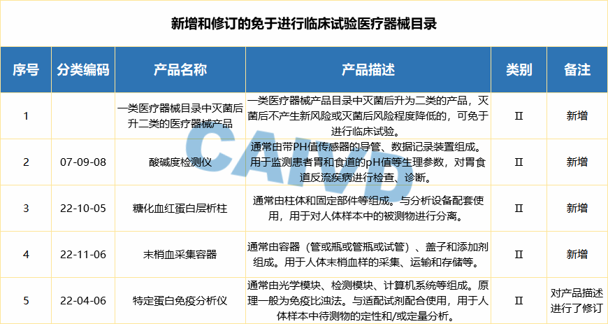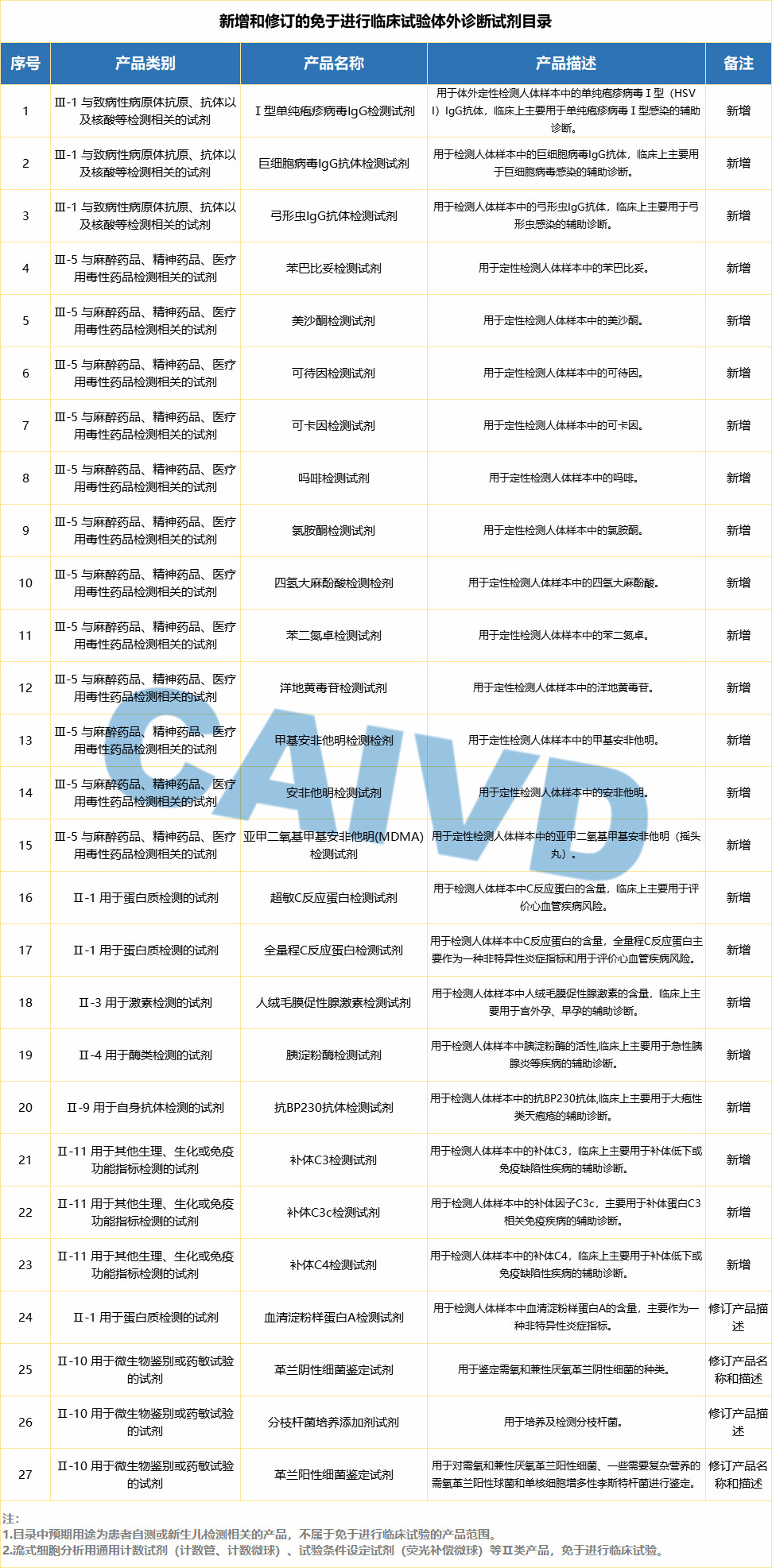 近日,國家藥監(jiān)局發(fā)布新增和修訂的免于進行臨床試驗醫(yī)療器械目錄的通告(2019年第91號),并組織制定了新增和修訂的免于進行臨床試驗醫(yī)療器械目錄、新增和修訂的免于進行臨床試驗體外診斷試劑目錄。其中,明確31個體外診斷產(chǎn)品免于進行臨床試驗,以及一類醫(yī)療器械產(chǎn)品目錄中滅菌后升為二類的產(chǎn)品,滅菌后不產(chǎn)生新風險或滅菌后風險程度降低的,可免于進行臨床試驗。詳細如下: