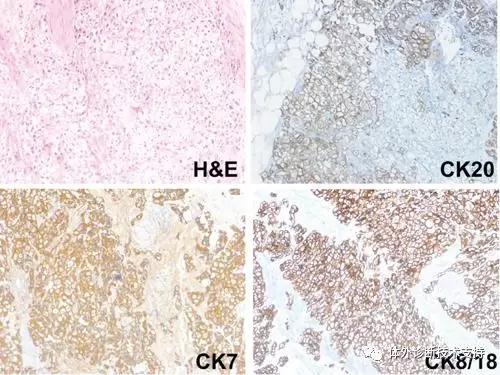 對于來源不明的轉(zhuǎn)移瘤,用免疫組化技術(shù)有助于確定惡性腫瘤的組織學(xué)來源,進(jìn)一步確定原發(fā)部位。如角蛋白抗體(CK20)在胃腸道癌、膽管癌、胰腺癌中陽性,而在肺癌、乳腺癌、腎癌中陰性;Tg陽性可考慮甲狀腺轉(zhuǎn)移;波形蛋白(Vimentin)陽性支持肉瘤的診斷;前列腺特異性抗原(PAS)陽性可考慮前列腺轉(zhuǎn)移;甲狀腺球蛋白陽性可考慮甲狀腺濾泡細(xì)胞癌;肌動蛋白(Actin)、肌球蛋白(Myosin)、結(jié)蛋白(Desmin)、肌紅蛋白(Myoglobin)陽性可考慮橫紋肌肉瘤;S-100蛋白陽性支持黑色素瘤的診斷;等等這些都為腫瘤的治療及預(yù)后提供了依據(jù)。