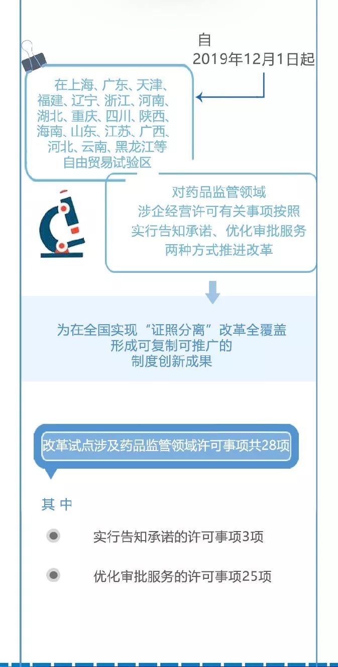 2019年11月29日,國家藥監(jiān)局關(guān)于印發(fā)《國家藥品監(jiān)督管理局貫徹落實(shí)國務(wù)院在自由貿(mào)易試驗(yàn)區(qū)開展“證照分離”改革全覆蓋試點(diǎn)實(shí)施方案》的通知,明確在上海、廣東、天津、福建、遼寧、浙江、河南、湖北、重慶、四川、陜西、海南、山東、江蘇、廣西、河北、云南、黑龍江省實(shí)施改革。