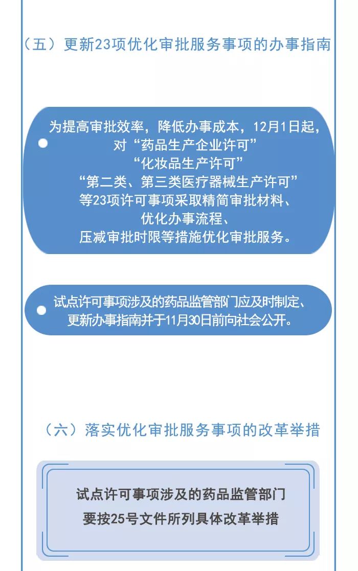 方案提出分類推進(jìn)審批制度改革,完善簡約透明的行業(yè)準(zhǔn)入規(guī)則,進(jìn)一步擴(kuò)大醫(yī)療器械企業(yè)經(jīng)營自主權(quán);更新23項(xiàng)優(yōu)化審批服務(wù)事項(xiàng)的辦事指南,“第二類、第三類醫(yī)療生產(chǎn)許可”等23項(xiàng)許可事項(xiàng)采取精簡審批材料、優(yōu)化辦事流程、壓減審批時(shí)限等措施優(yōu)化審批服務(wù)。完整方案解讀如下: