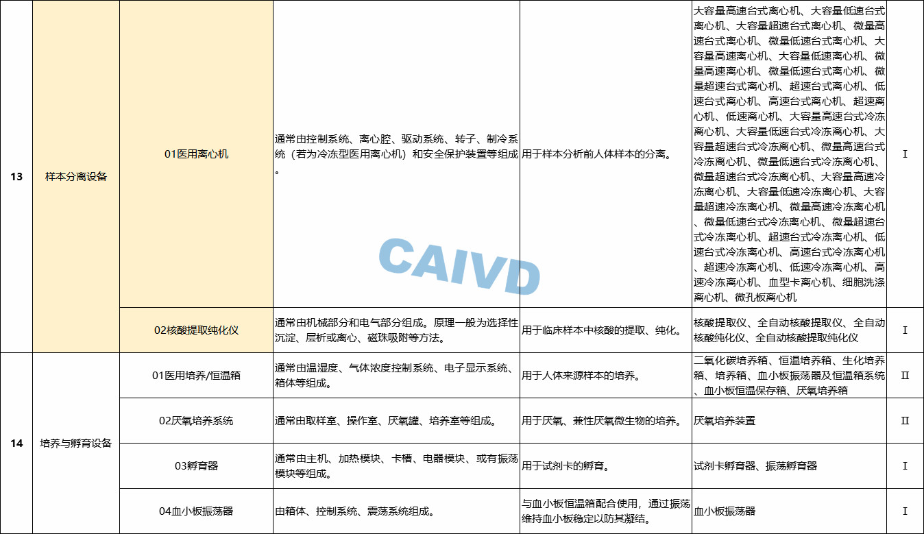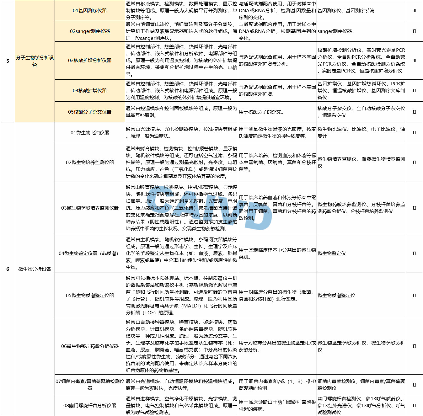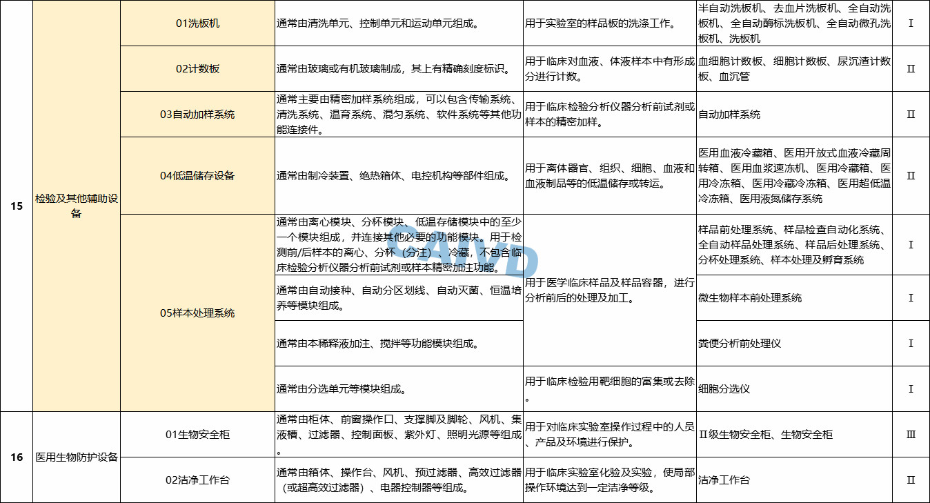 本目錄包括用于臨床檢驗實驗室的設備、儀器、輔助設備和器具及醫(yī)用低溫存貯設備,不包括體外診斷試劑。本目錄主要以檢驗學科和設備性能為依據,分為16個一級產品類別,其中,臨床檢驗分析設備10個,采樣設備1個,樣本處理設備3個,檢驗及其他輔助設備和醫(yī)用生物防護設備各1個。按照學科內儀器類別細分為86個二級產品類別,列出411個品名舉例。詳細如下: