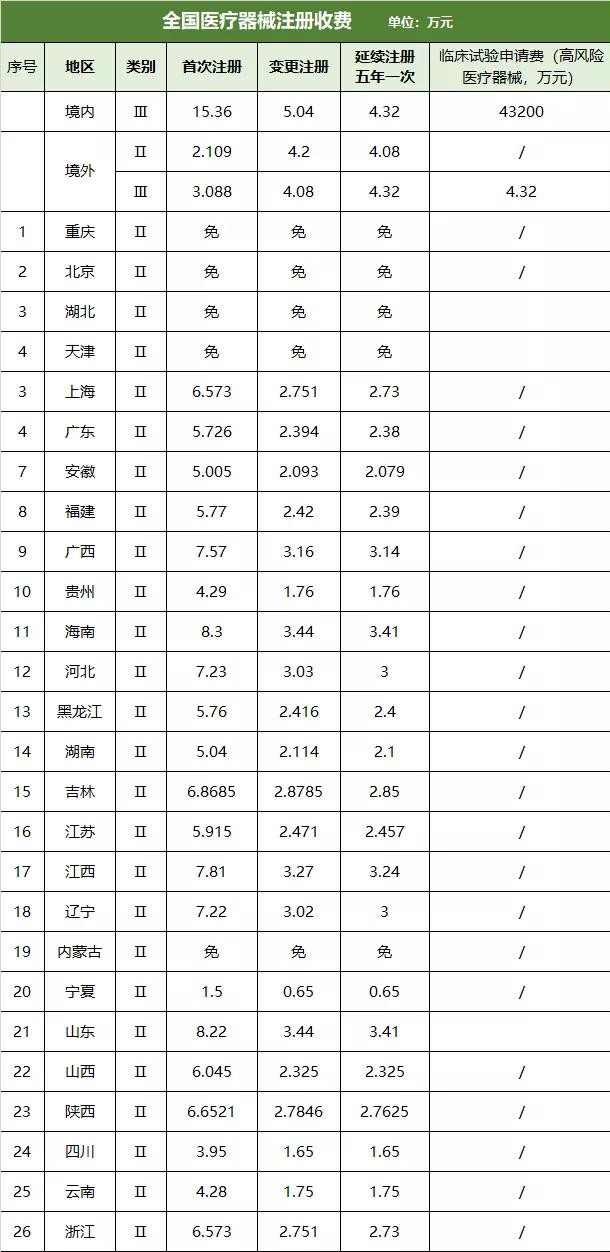 自2015年11月,福建省第一個宣布對醫(yī)療器械注冊征收費用。隨后,江西、上海、海南、山東、內(nèi)蒙古、北京、浙江、安徽、陜西、吉林、河北、江蘇、寧夏、天津、黑龍江、廣東、湖南、四川、重慶、廣西、云南、貴州、遼寧、湖北等地也緊隨其后,先后宣布對各地的醫(yī)療器械注冊進行收費。