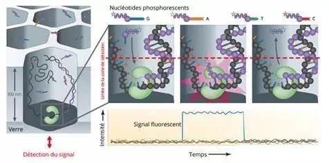 不同于Sanger 測序法所使用的合成后測序理念,Ronaghi分別于1996 年與1998 年提出了在固相與液相載體中通過邊合成邊測序的方法-焦磷酸測序。其基本原理是利用引物鏈延伸時所釋放的焦磷酸基團激發(fā)熒光,通過峰值高低判斷與其相匹配的堿基數(shù)量。由于使用了實時熒光監(jiān)測的概念,焦磷酸測序?qū)崿F(xiàn)了對特定位點堿基負荷比例的定量,因此在SNP 位點檢測、等位基因( 突變)頻率測定、細菌和病毒分型檢測方面應(yīng)用廣泛。由于熒光報告原理不同,其對于序列變異的檢測靈敏度從Sanger 測序的20%提高到了5%。但由于該技術(shù)的儀器采購與單次檢測成本較高,目前尚未得到大規(guī)模的臨床使用。