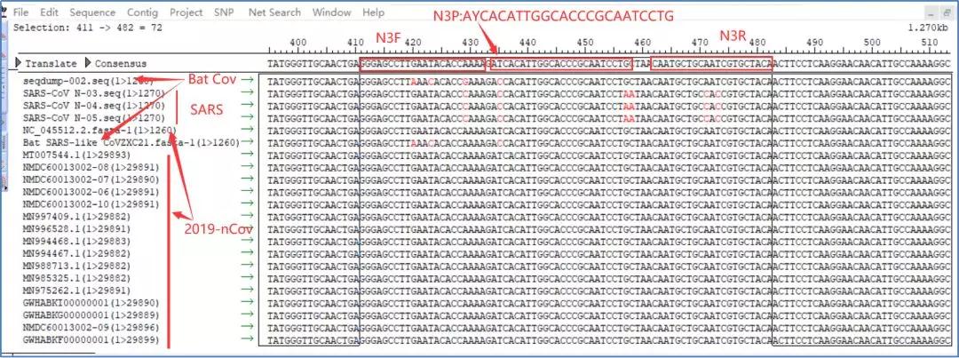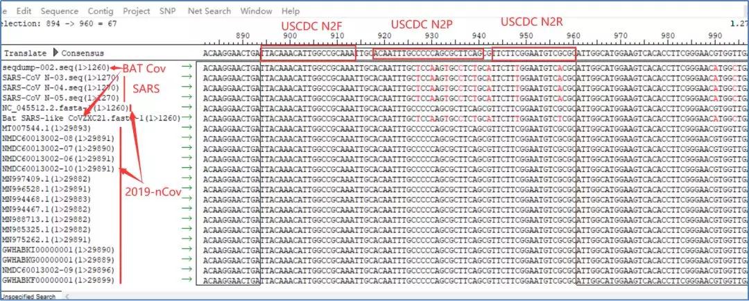 用SARS和蝙蝠CoV的N基因序列作為對照,對新型冠狀病毒的N基因序列排序,從圖1、2、3中可見,在美國CDC的設計中,除了第二套的上游引物不特異外,其余探針和引物的位置都是選擇了組內(nèi)保守組間特異的區(qū)域。第二套的探針和下游引物都是在特異的區(qū)域,所以也不會產(chǎn)生非特異的擴增。