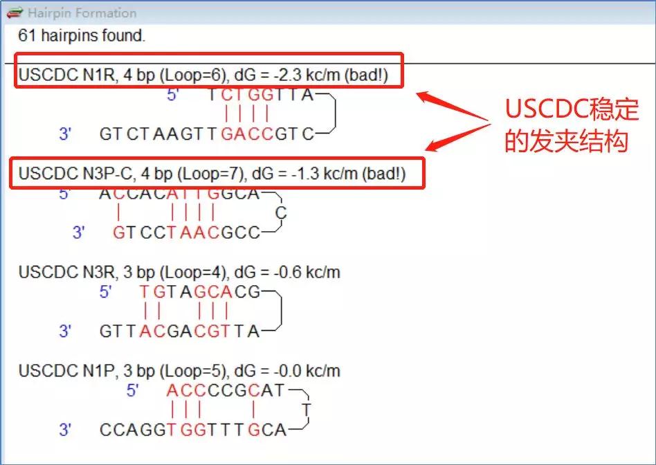 5) 引物的發(fā)夾結構穩(wěn)定(美國CDC N基因第一套的反向引物、香港大學Orf1b基因的正向及反向引物、香港大學N基因的正向引物);