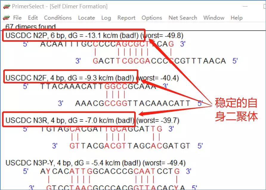 設計時通常將二聚體(自身二聚體或配對二聚體)控制在dG>-5.0kc/m, 最好dG>-3.6 kc/m。從圖8顯示的三套引物探針的自身二聚體可見,第二套的探針具有一個非常穩(wěn)定的自身二聚體(dG=-13.1kc/m),第二套的上游引物N2F有一個穩(wěn)定的自身二聚體(dG=-9.3kc/m),第三套下游引物具有一個比較穩(wěn)定的自身二聚體(dG=-7.0kc/m)。