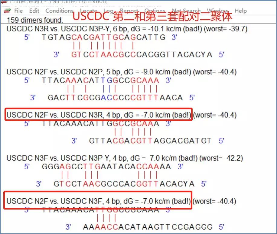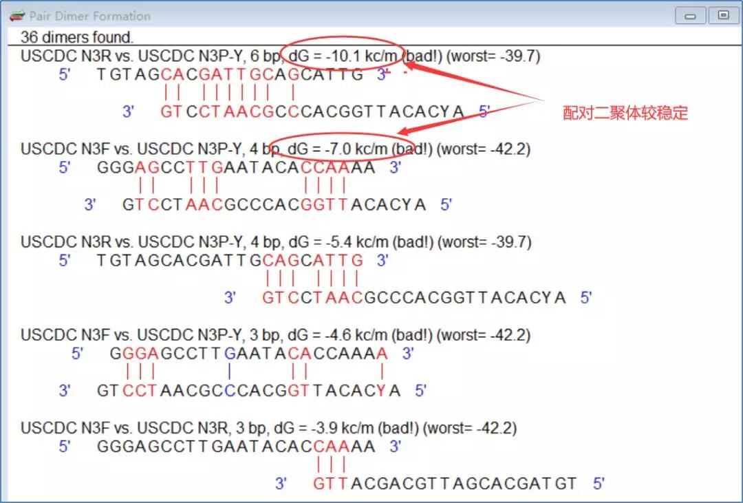 7) 引物探針的配對二聚體穩(wěn)定(中國CDC的N基因、美國N基因第二和第三套、德國的E基因)。