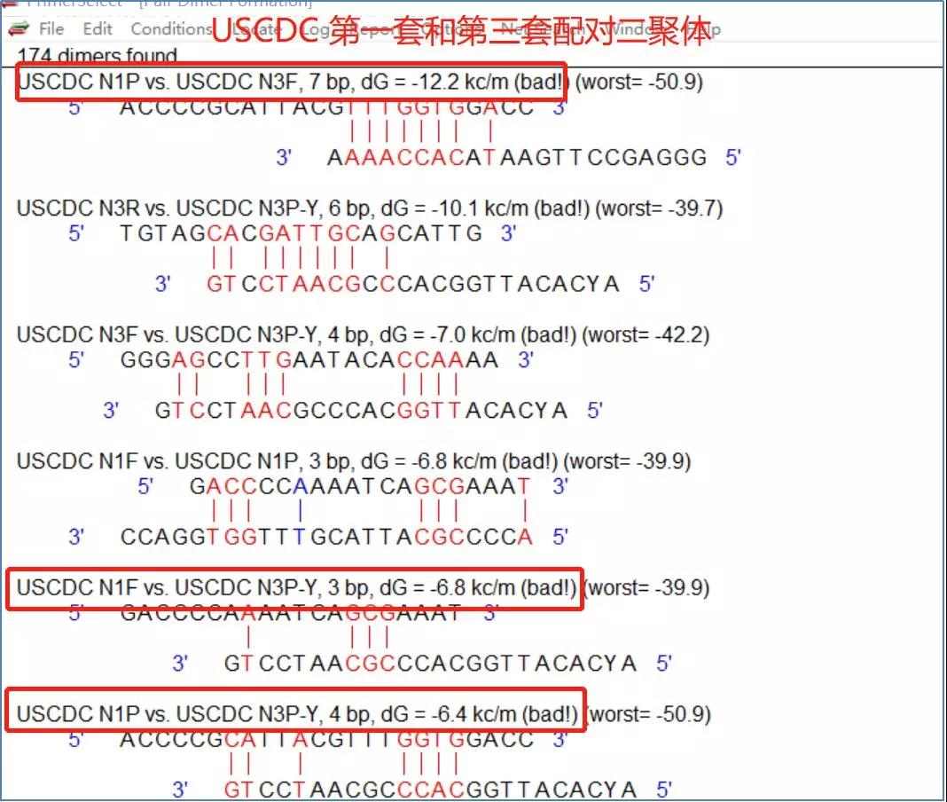 綜上所述,美國CDC設計的三套引物探針,位置的選擇及Tm值的設計均比較合理,但是二級結構比較穩(wěn)定。第一套的反向引物N1R存在一個非常穩(wěn)定的發(fā)夾(dG=-2.3kc/m,圖7)。第二套探針的自身二聚體非常穩(wěn)定(dG=-13.1kc/m,圖8),上游引物自身二聚體也比較穩(wěn)定(dG=-9.3kc/m,,圖8),比較穩(wěn)定的配對二聚體比較多(dG=-6.8 ~ 9.0kc/m,圖9),引物和探針的利用效率會比較低。第三套探針N3P具有一個相對穩(wěn)定的發(fā)夾(dG=-1.3kc/m,圖7),探針和引物值均有相對穩(wěn)定的配對二聚體(圖10)。