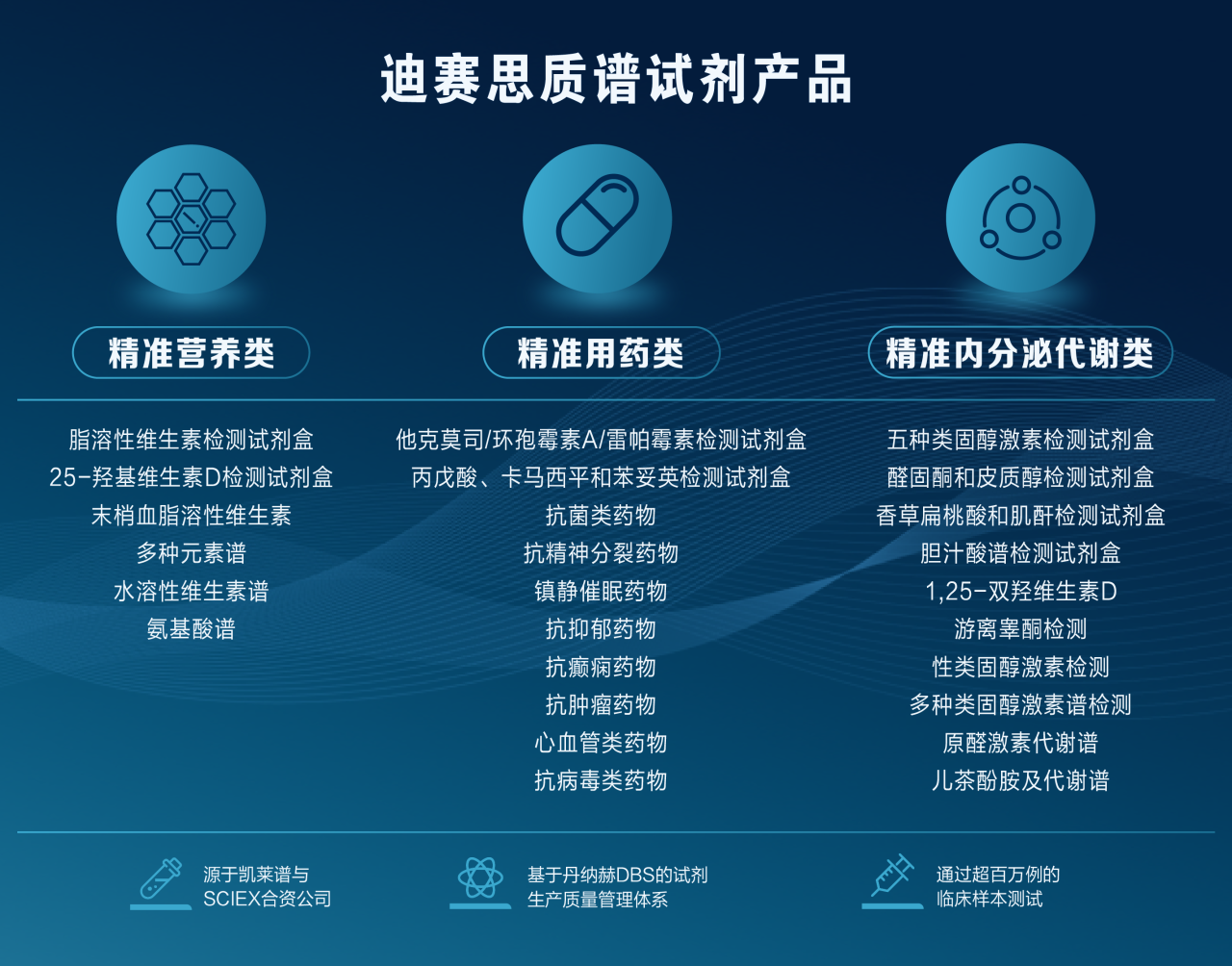 同時(shí),凱萊譜與SCIEX合資企業(yè)迪賽思診斷,已通過自主研發(fā)為中國(guó)臨床用戶推出了類固醇激素、25-羥基維生素D、脂溶性維生素群、膽汁酸譜、抗癲癇藥物濃度、免疫抑制劑藥物濃度等多款獲得二類醫(yī)療器械注冊(cè)證的臨床質(zhì)譜試劑盒產(chǎn)品,可適用于凱萊譜、SCIEX等品牌的臨床質(zhì)譜檢測(cè)系統(tǒng)。