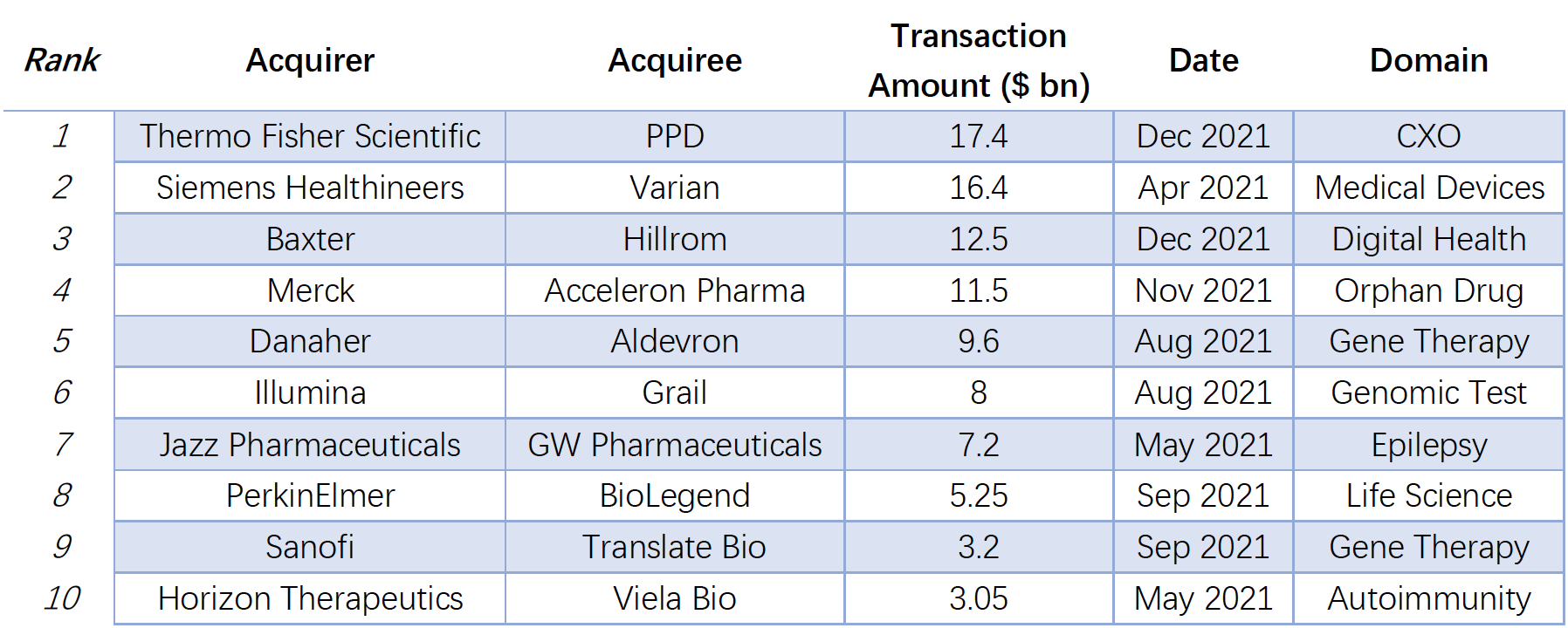 In 2021, global M&A transactions in the biomedical field will basically return to pre-pandemic levels. Enterprises are actively developing in cutting-edge fields such as CXO, digital health, gene therapy, precision medicine etc. According to public statistics, the transaction value of the global TOP10 healthcare M&A deals in 2021 will all be more than $3 billion, of which Thermo Fisher’s acquisition of PPD for $17.4 billion ranks first. In addition, due to AstraZeneca’s block, Advent Capital and Aurora’s $8.1 billion acquisition of Sobi failed, so it was not included in the calculation.