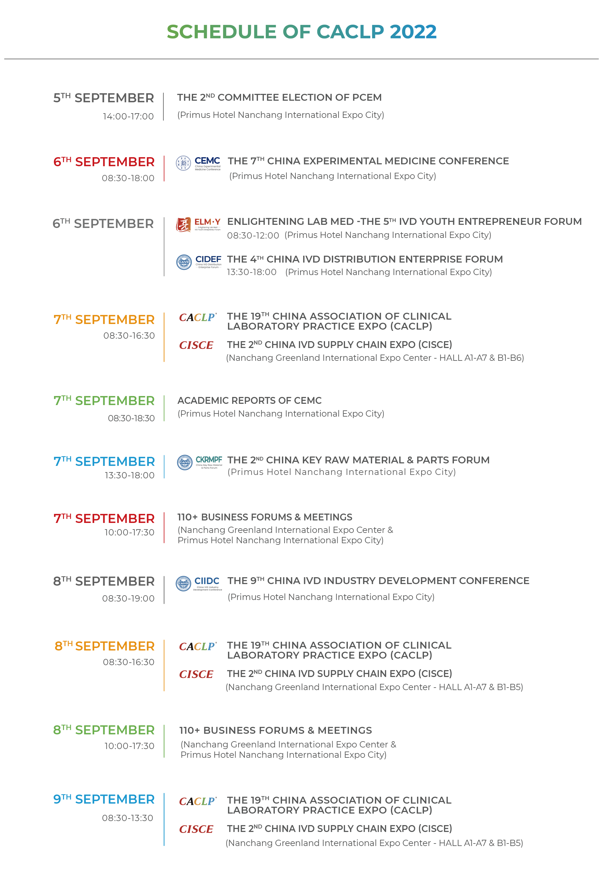 l The 19th edition of China Association of Clinical Laboratory Practice Expo (CACLP) will be postponed to 7-9 September 2022, at the Nanchang Greenland International Expo Center, Nanchang City, China.