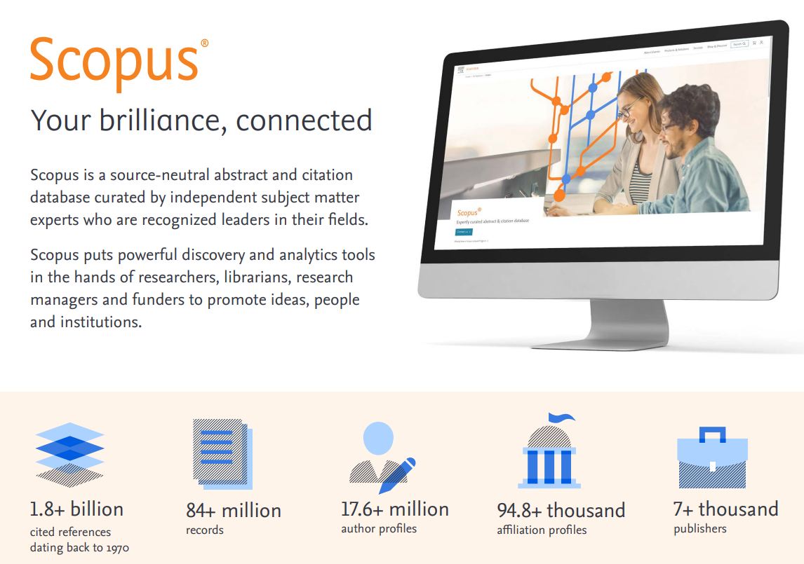 Scopus uniquely combines a comprehensive, expertly curated abstract and citation database with enriched data and linked scholarly literature across a wide variety of disciplines. Scopus quickly finds relevant and authoritative research, identifies experts and provides access to reliable data, metrics and analytical tools. Be confident in progressing research, teaching or research direction and priorities — all from one database and with one subscription.