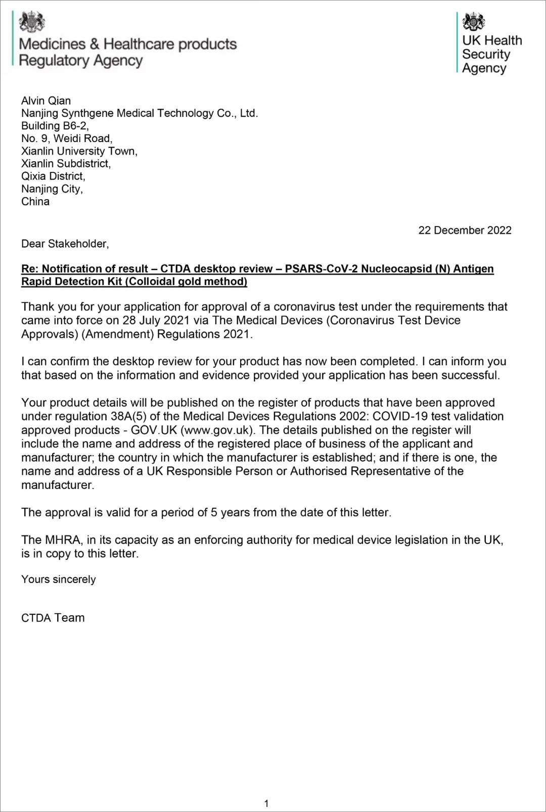 Recently, Nanjing Synthgene Medical Technology Co., Ltd. added good news. The independently developed "COVID-19 antigen detection kit SARS-COV-2 Nucleocapsid (N) Antigen Rapid Detection Kit (Colloidal gold method)" by Synthgene Medical Technology was approved by the UK 5-year CTDA certification, which is another international authoritative certification of this product after dozens of certifications such as China's NMPA and EU CE self-test. The successful approval of this product means that the Synthgene New Corona Antigen Self Test Kit can be sold in the UK, further serving the needs of normal epidemic prevention of COVID-19 in the UK.