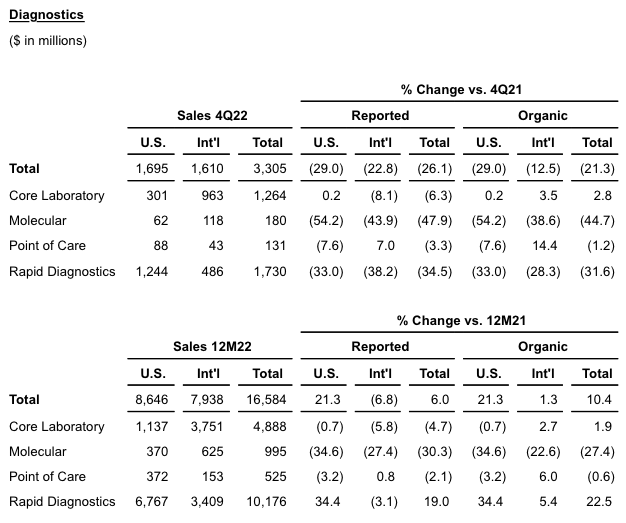 As expected, Diagnostics sales in the fourth quarter were negatively impacted by year-over-year declines in COVID-19 testing-related sales. Worldwide COVID-19 testing-related sales were $1.069 billion in the fourth quarter of 2022 compared to $2.319 billion in the fourth quarter of the prior year.