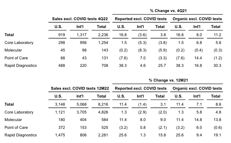 Note: Management believes that measuring sales growth rates on an organic basis is an appropriate way for investors to best understand the underlying performance of the business. Organic sales growth excludes the impact of foreign exchange. In order to compute results excluding the impact of exchange rates, current year U.S. dollar sales are multiplied or divided, as appropriate, by the current year average foreign exchange rates and then those amounts are multiplied or divided, as appropriate, by the prior year average foreign exchange rates. Management further believes that measuring sales growth rates on an organic basis excluding COVID-19 tests is an appropriate way for investors to best understand the underlying performance of the business in the fourth quarter ended Dec. 31, 2022 as well as in 2023 as the COVID-19 pandemic shifts to an endemic state, resulting in significantly lower expected demand for COVID-19 tests.