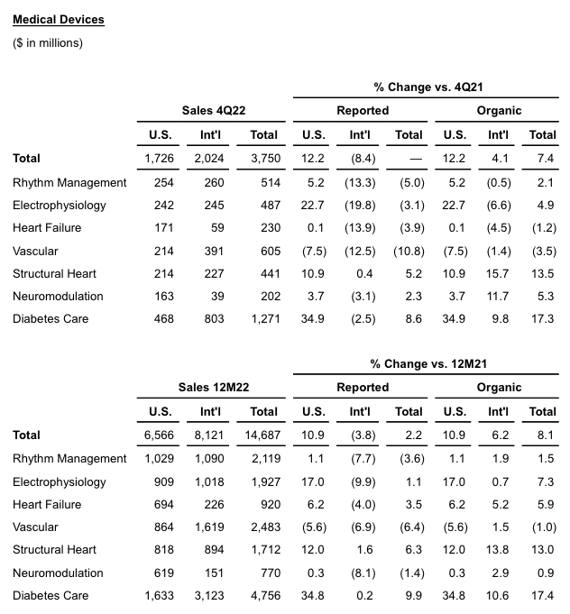 Worldwide Medical Devices sales were flat on a reported basis and increased 7.4 percent on an organic basis in the fourth quarter. Sales growth in the U.S. was led by strong double-digit growth in Electrophysiology, Structural Heart and Diabetes Care. Internationally, sales growth was negatively impacted by intermittent COVID-19 lockdown restrictions in China as well as supply constraints in certain areas, including Electrophysiology and Diabetes Care.