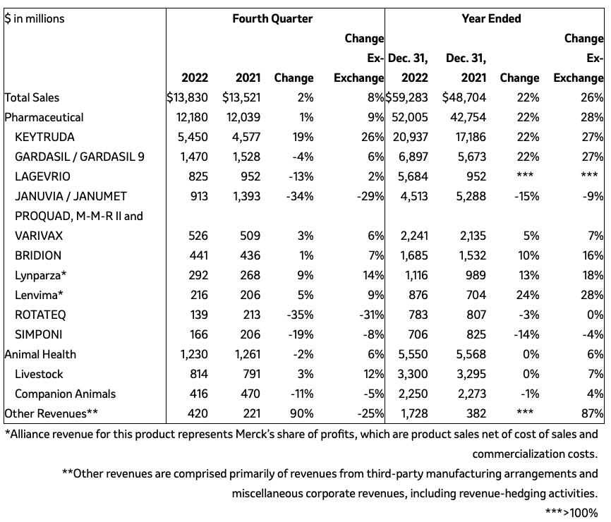 Full-year 2022 pharmaceutical sales grew 22% to $52.0 billion. Pharmaceutical sales growth was 16% excluding LAGEVRIO and the unfavorable impact of foreign exchange, primarily driven by higher sales in oncology, particularly KEYTRUDA, higher sales of vaccines, reflecting strong growth of GARDASIL/GARDASIL 9 and the ongoing pediatric launch of VAXNEUVANCE, as well as growth in hospital acute care products, including ZERBAXA and BRIDION (sugammadex) injection 100 mg/mL, a medicine for the reversal of neuromuscular blockade induced by rocuronium bromide or vecuronium bromide in adults and pediatric patients ages 2 years and older undergoing surgery. Pharmaceutical sales growth in 2022 was partially offset by lower sales of JANUVIA and JANUMET, primarily reflecting lower demand in Europe as a result of generic competition, and a decline in PNEUMOVAX 23 sales as the U.S. market continues to shift toward newer adult pneumococcal conjugate vaccines. COVID-19-related disruptions negatively affected sales in 2022, but to a lesser extent than in 2021, which benefited year-over-year sales growth.
