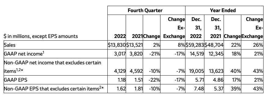 Generally Accepted Accounting Principles (GAAP) earnings per share (EPS) assuming dilution was $1.18 for the fourth quarter and $5.71 for the full year of 2022. Non-GAAP EPS was $1.62 for the fourth quarter and $7.48 for the full year of 2022. The declines in GAAP and non-GAAP EPS in the fourth quarter versus the prior year were primarily due to lower fourth quarter 2021 effective tax rates and the unfavorable impact of foreign exchange, partially offset by strong underlying business performance. The GAAP EPS decline in the fourth quarter also reflects the unfavorable impact of losses from investments in equity securities compared with gains in the prior year. Full-year 2022 and 2021 GAAP and non-GAAP EPS were negatively impacted by $0.22 and $0.65, respectively, related to an asset acquisition, and collaboration and licensing agreements.