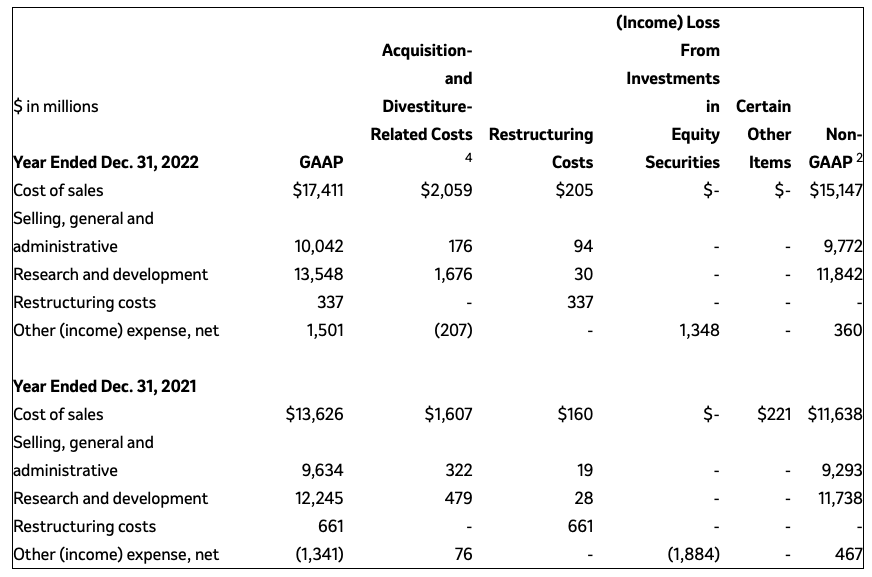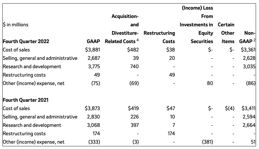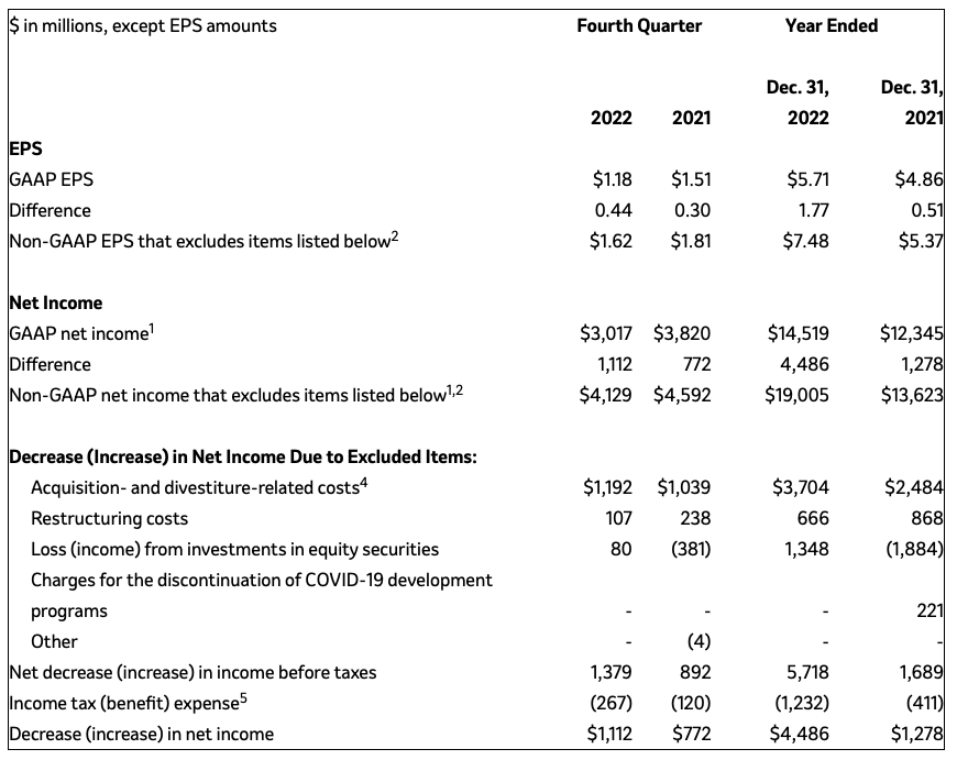 Non-GAAP EPS excludes acquisition- and divestiture-related costs (including pretax intangible asset impairment research and development [R&D] charges of $780 million and $1.7 billion in the fourth quarter and full year of 2022, respectively, largely related to nemtabrutinib) and restructuring costs, as well as income and losses from investments in equity securities.