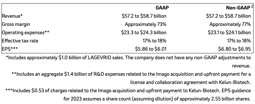 Merck expects full-year 2023 non-GAAP EPS to be between $6.80 and $6.95, including a negative impact of foreign exchange of approximately 4%. The non-GAAP range excludes acquisition- and divestiture-related costs, costs related to restructuring programs, as well as income and losses from investment in equity securities.