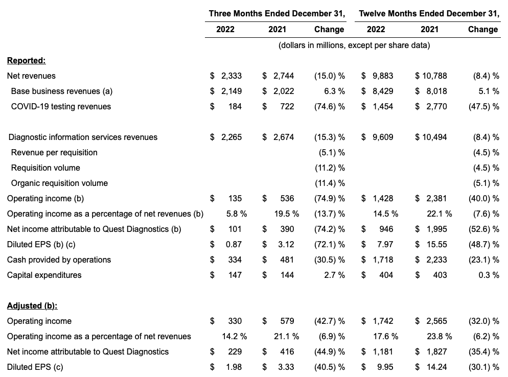 Quest Diagnostics Incorporated (NYSE: DGX), the world's leading provider of diagnostic information services, announced today financial results for the fourth quarter and full year ended December 31, 2022.