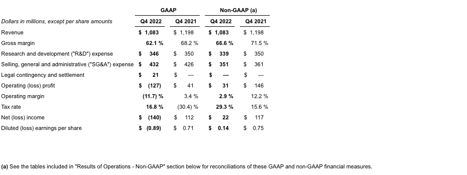 Capital expenditures for free cash flow purposes were $88 million for Q4 2022. Cash flow provided by operations was $147 million, compared to $282 million in the prior year period. Free cash flow (cash flow provided by operations less capital expenditures) was $59 million for the quarter, compared to $212 million in the prior year period. Depreciation and amortization expenses were $107 million for Q4 2022. At the close of the quarter, the company held $2,037 million in cash, cash equivalents and short-term investments, compared to $1,339 million as of January 2, 2022. Cash as of the close of the quarter included $991 million in net proceeds from the term notes issued on December 13, 2022.