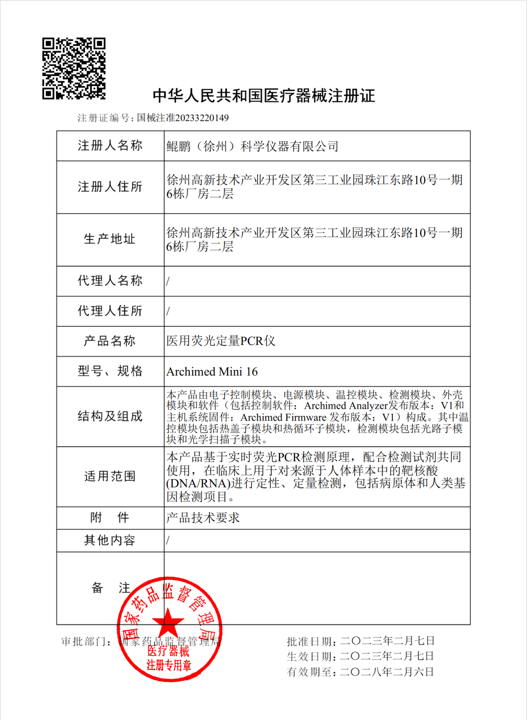 On February 7 2023, RocGene's independently developed Archimed Mini 16 Medical Fluorescence Quantitative PCR Instrument obtained the Class III Medical Device Registration Certificate approved by the National Medical Products Administration, with registration number of NMPA Approval No. 20233220149.