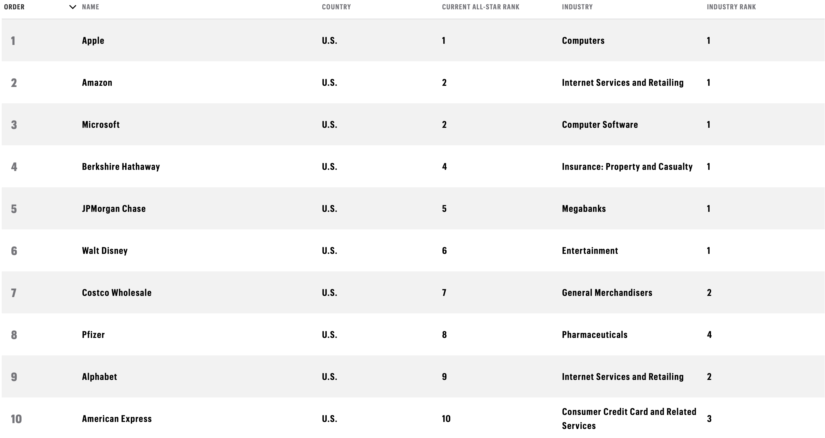 Fortune continued to cooperate with Korn Ferry on this corporate reputation survey. To obtain a list of the 50 most admired companies, Korn Ferry asked 3,760 executives, directors and securities analysts who responded to select their 10 most admired companies. Their selection ranged from companies that were in the top 25% of last year's survey to companies that were in the top 20% of their respective industry surveys last year. The voting is not limited to industries and enterprises. The list is designed to reflect various elements. The All-Star list ranks companies based on praise from across the industry, including from business partners.