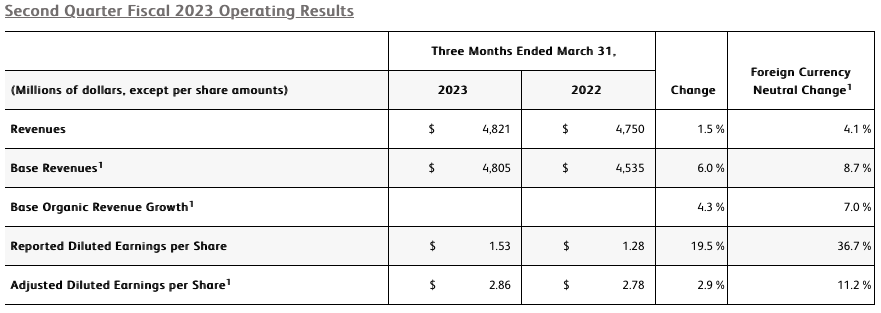 - The company now expects fiscal year 2023 adjusted diluted EPS to be $12.10 to $12.32 compared to $12.07 to $12.32previously announced. This reflects an increase of 1.5 cents at the mid-point, including an operational increase of 6.5 centsoffset by an incremental headwind of approximately 5 cents from foreign currency.