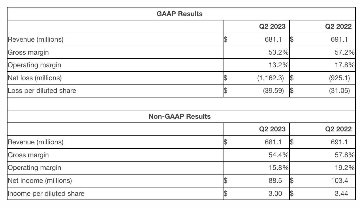 Non-GAAP gross margin was 54.4 percent for the second quarter of 2023 compared to 57.8 percent during the second quarter of 2022.