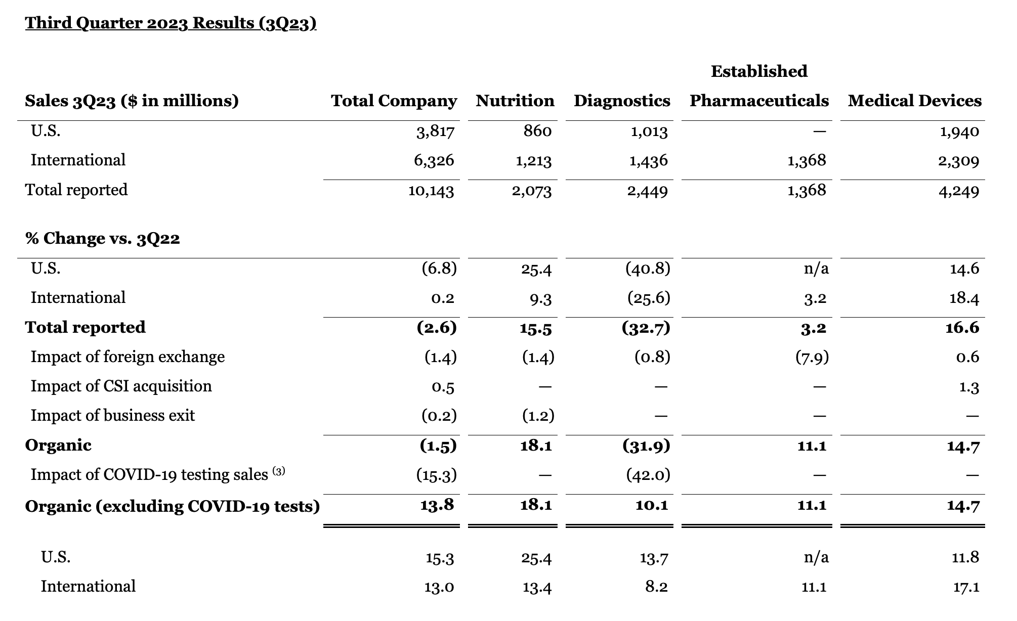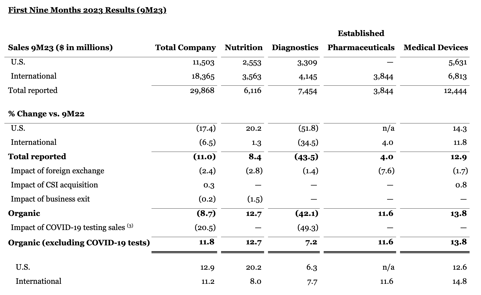 Management believes that measuring sales growth rates on an organic basis, which excludes the impact of foreign exchange, the impact of exiting the pediatric nutrition business in China, and the impact of the acquisition of Cardiovascular Systems, Inc. (CSI), is an appropriate way for investors to best understand the core underlying performance of the business. Management further believes that measuring sales growth rates on an organic basis excluding COVID-19 tests is an appropriate way for investors to best understand underlying base business performance as the COVID-19 pandemic has shifted to an endemic state, resulting in significantly lower demand for COVID-19 tests.
