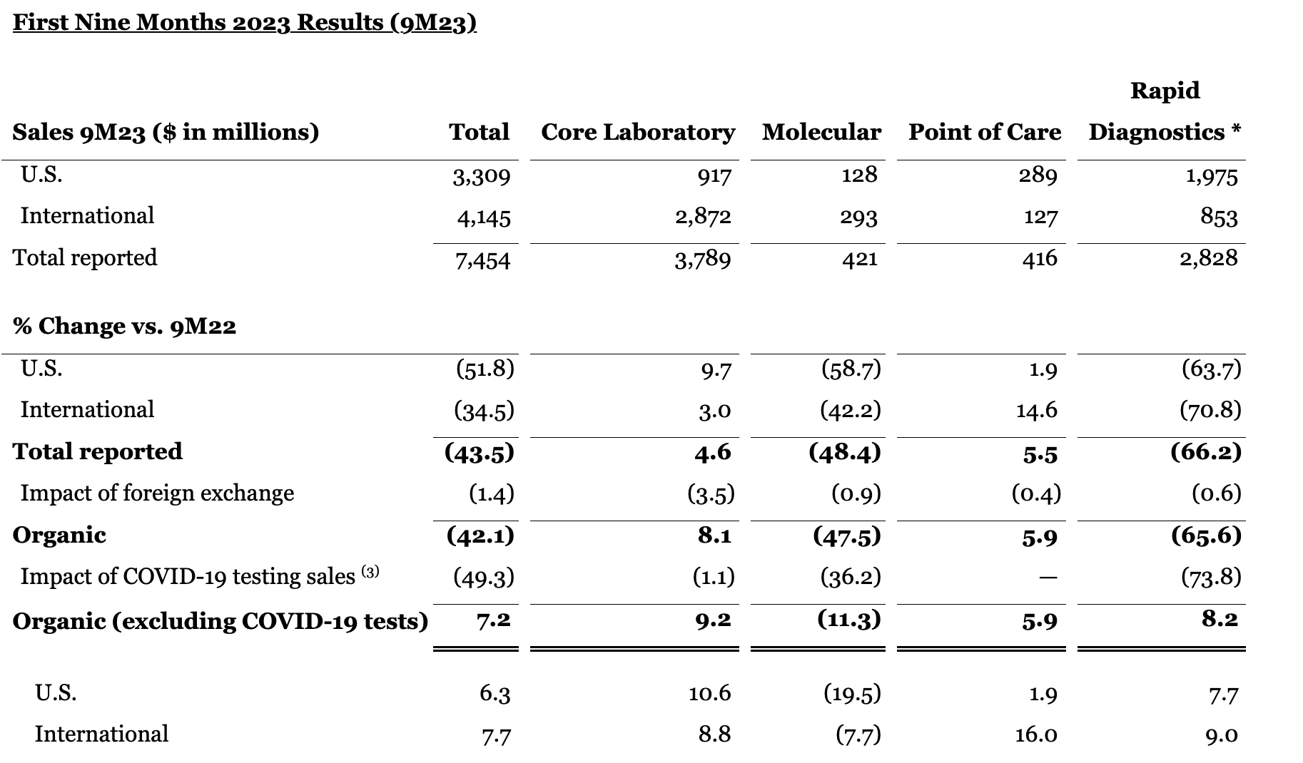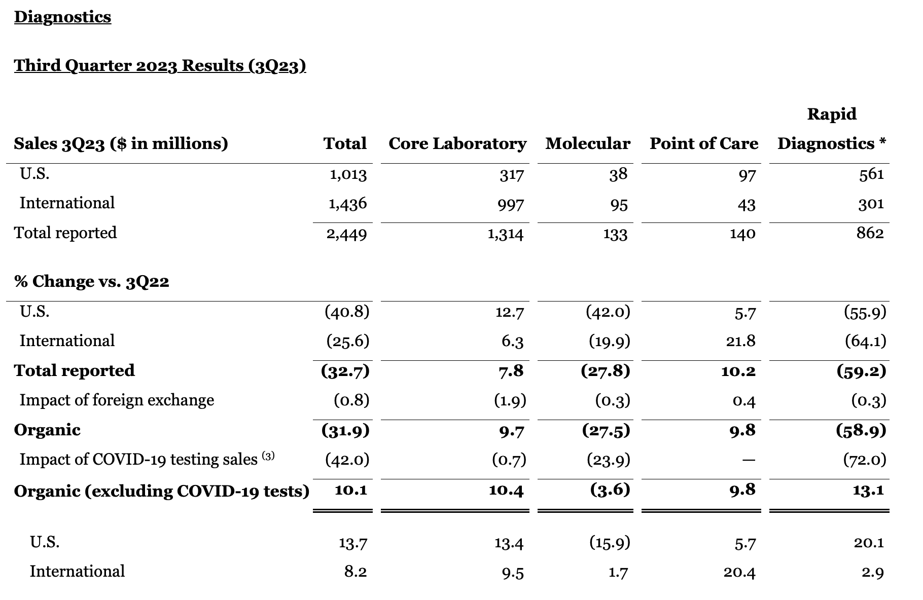 As expected, Diagnostics sales growth in the third quarter was negatively impacted by year-over-year declines in COVID-19 testing-related sales3. Worldwide COVID-19 testing sales were $305 million in the third quarter of 2023 compared to $1.671 billion in the third quarter of the prior year.