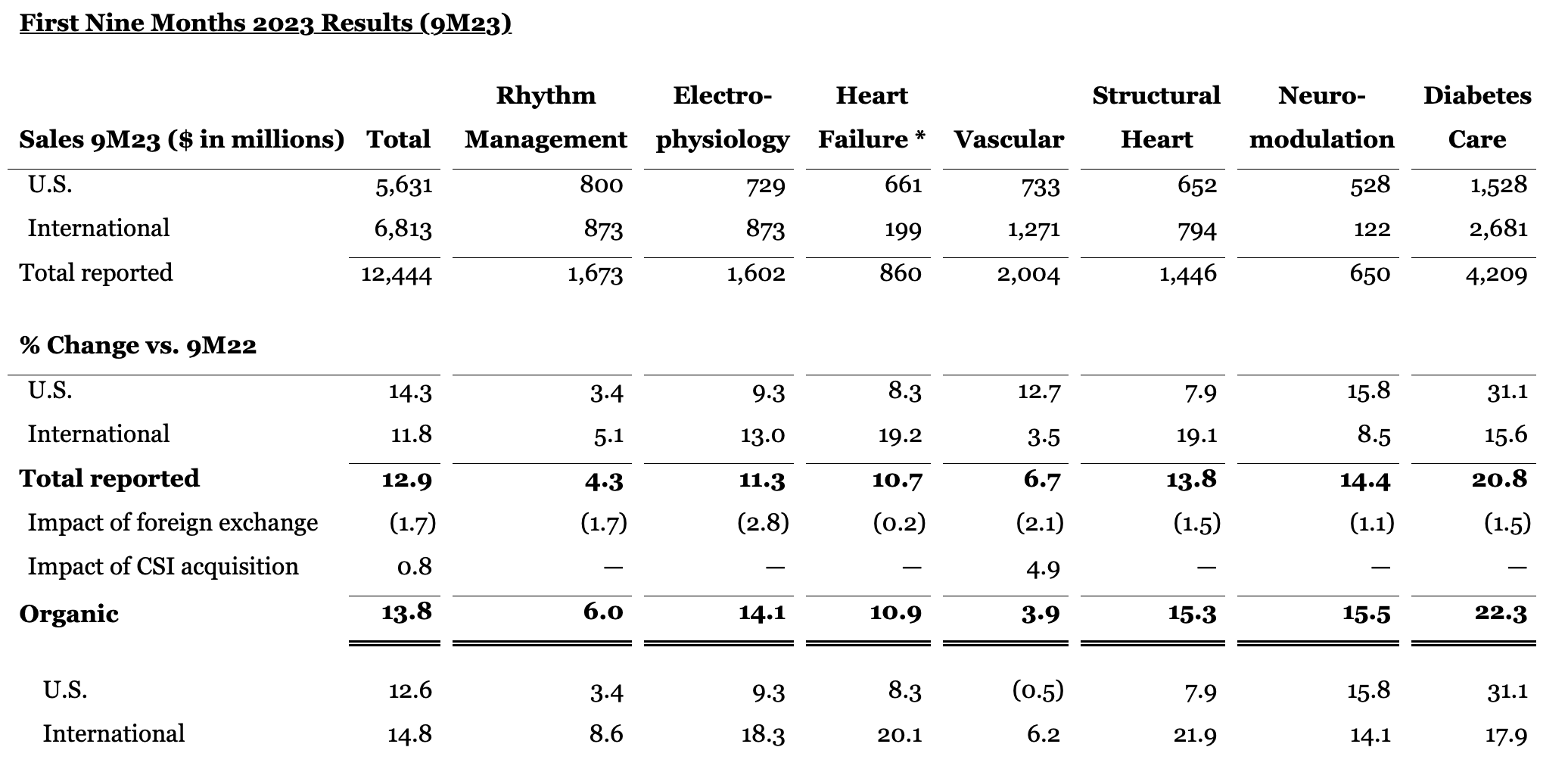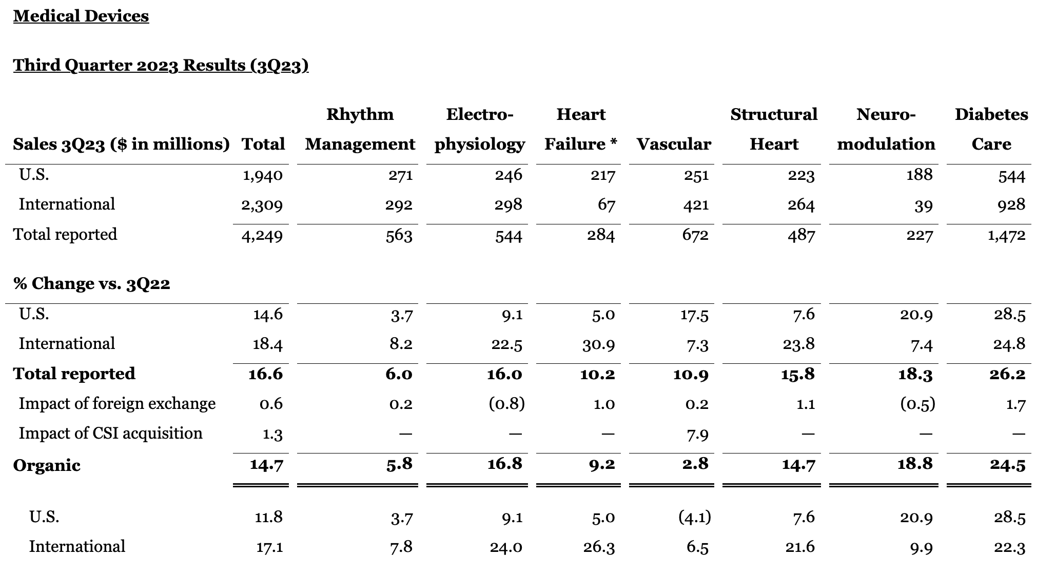 Worldwide Medical Devices sales increased 16.6 percent on a reported basis and 14.7 percent on an organic basis in the third quarter. Sales growth was led by double-digit organic growth in Diabetes Care, Electrophysiology, Structural Heart, and Neuromodulation. Several recently launched products and new indications contributed to the strong performance, including Amplatzer® Amulet®, Navitor®, TriClip®, and AVEIR.