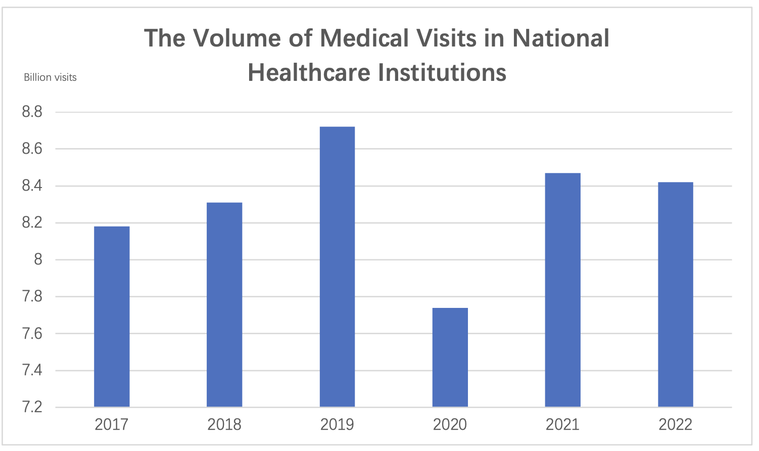 In 2022, public hospitals had 3.19 billion medical visits (83.4% of the total hospital visits), and private hospitals had 0.63 billion medical visits (16.6% of the total hospital visits). In 2022, township health centers and community health service centers (stations) had 2.04 billion medical visits, an increase of 40 million compared to the previous year. The medical visits to township health centers and community health service centers (stations) accounted for 24.2% of the total medical visits, an increase of 0.7 percentage points compared to the previous year.