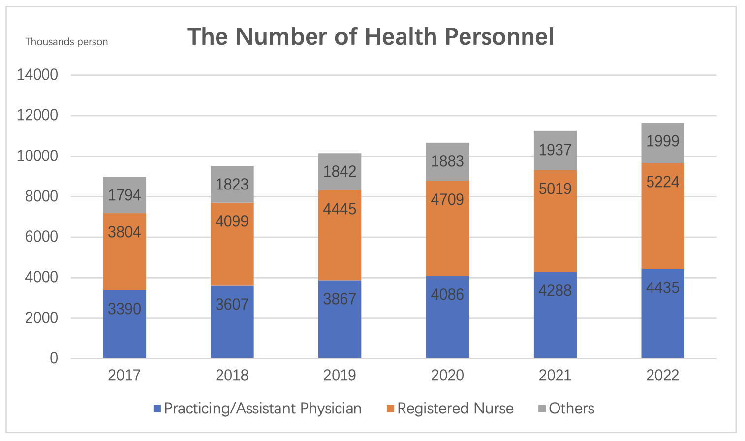 By the end of 2022, the total number of health personnel in the country was 14.41 million, an increase of 425,000 (3.0%) compared to the previous year. Among these health personnel, there were 4.43 million practicing (assistant) physicians and 5.22 million registered nurses. The distribution of health personnel at the end of 2022 was as follows: 8.748 million in hospitals (accounting for 60.7%), 4.551 million in primary healthcare institutions (accounting for 31.6%), and 979,000 in specialized public health institutions (accounting for 6.8%).