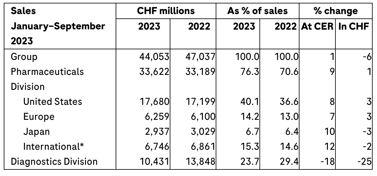 Overall, the Diagnostics Division achieved sales of CHF 10.4 billion. The 18% decrease was in line with the anticipated significant drop in demand for COVID-19 tests (CHF 0.4 billion in the first nine months of 2023, in contrast to CHF 3.6 billion in the same period last year).
