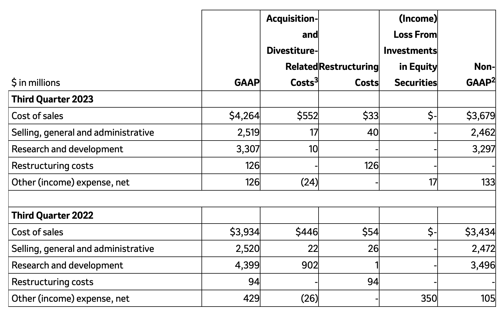 Non-GAAP R&D expenses were $3.3 billion in the third quarter of 2023 compared with $3.5 billion in the third quarter of 2022. The decrease was primarily due to charges of $690 million in 2022 related to collaboration and licensing agreements with Moderna, Orna and Orion. The decrease in R&D expenses was partially offset by higher compensation and benefit costs in 2023, reflecting in part increased headcount, higher investments in discovery research and early drug development and higher clinical development spending.