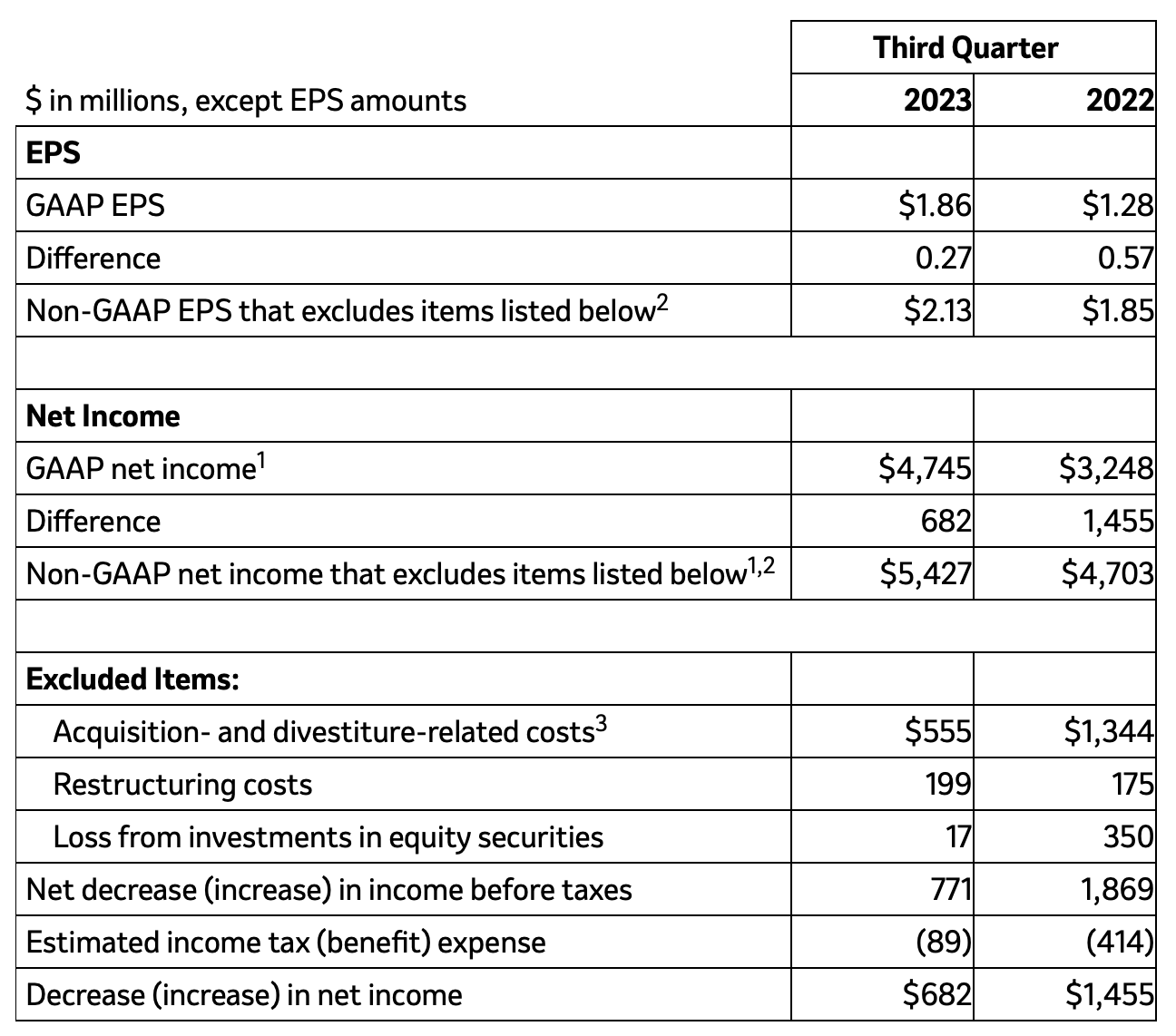 Generally Accepted Accounting Principles (GAAP) earnings per share (EPS) assuming dilution was $1.86 for the third quarter of 2023. Non-GAAP EPS was $2.13 for the third quarter of 2023. The increases in GAAP and non-GAAP EPS in the third quarter versus the prior year were primarily due to operational strength in the business, as well as $0.22 of charges recorded in 2022 related to collaboration and licensing agreements with Moderna, Inc. (Moderna), Orna Therapeutics (Orna) and Orion Corporation (Orion). The increase in GAAP EPS in the third quarter of 2023 was also driven by the impacts of intangible asset impairment charges recorded in 2022, compared with no such charges recorded in 2023, and lower losses from investments in equity securities in 2023. The increases in both GAAP and non-GAAP EPS in the third quarter were partially offset by the unfavorable impact of foreign exchange.
